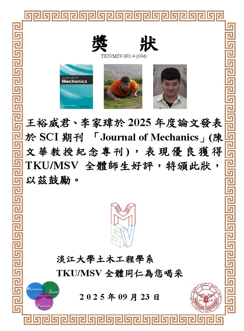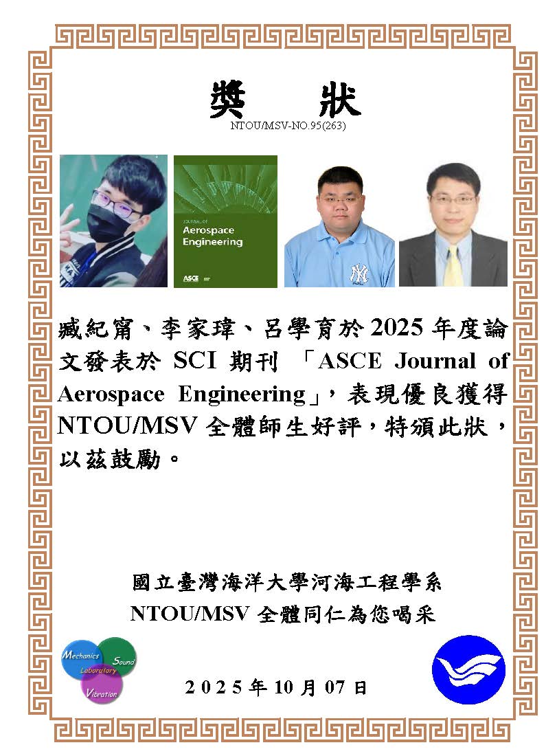 NTOU/MSV獎狀 (雙倍獎勵金期刊) JFM, JCP, IJNME, CMAME, Royal Society, IEEE